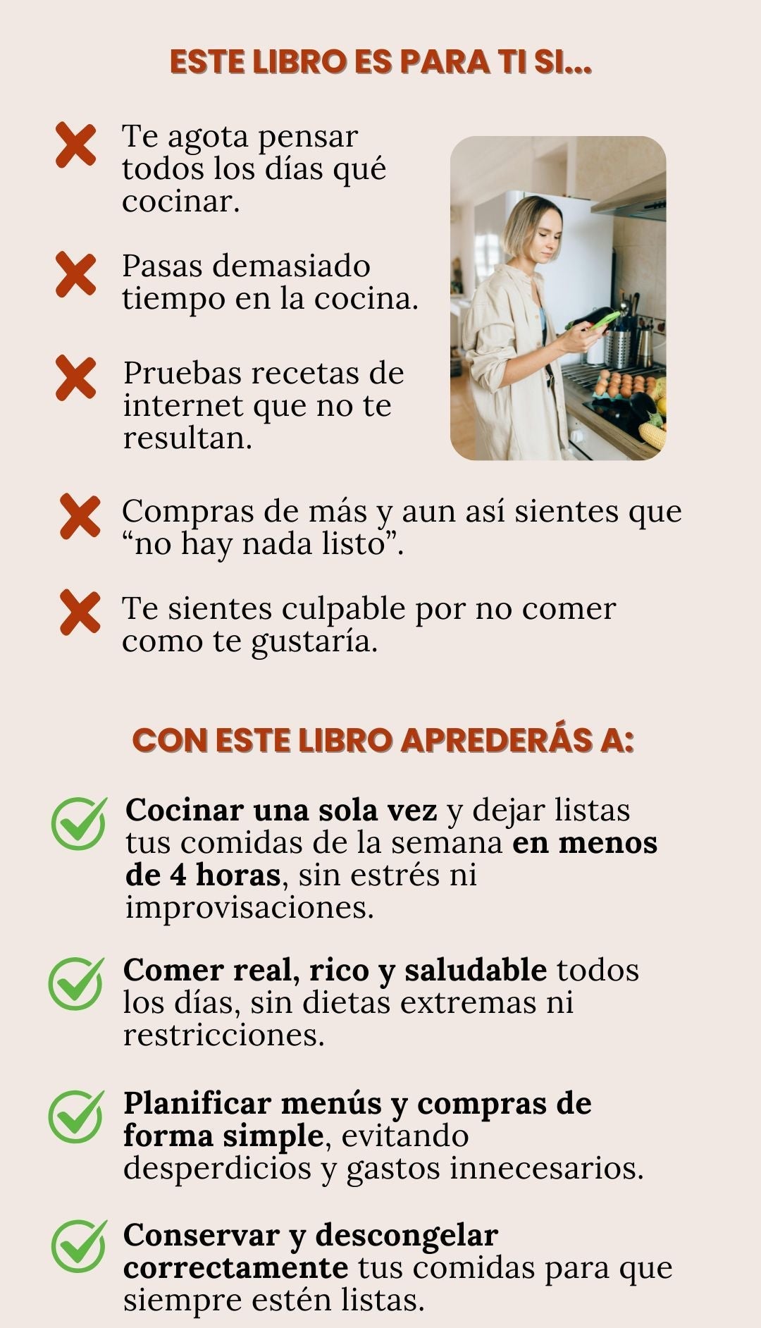 Te enseña un método práctico para cocinar menos, comer mejor y sentirte en control.